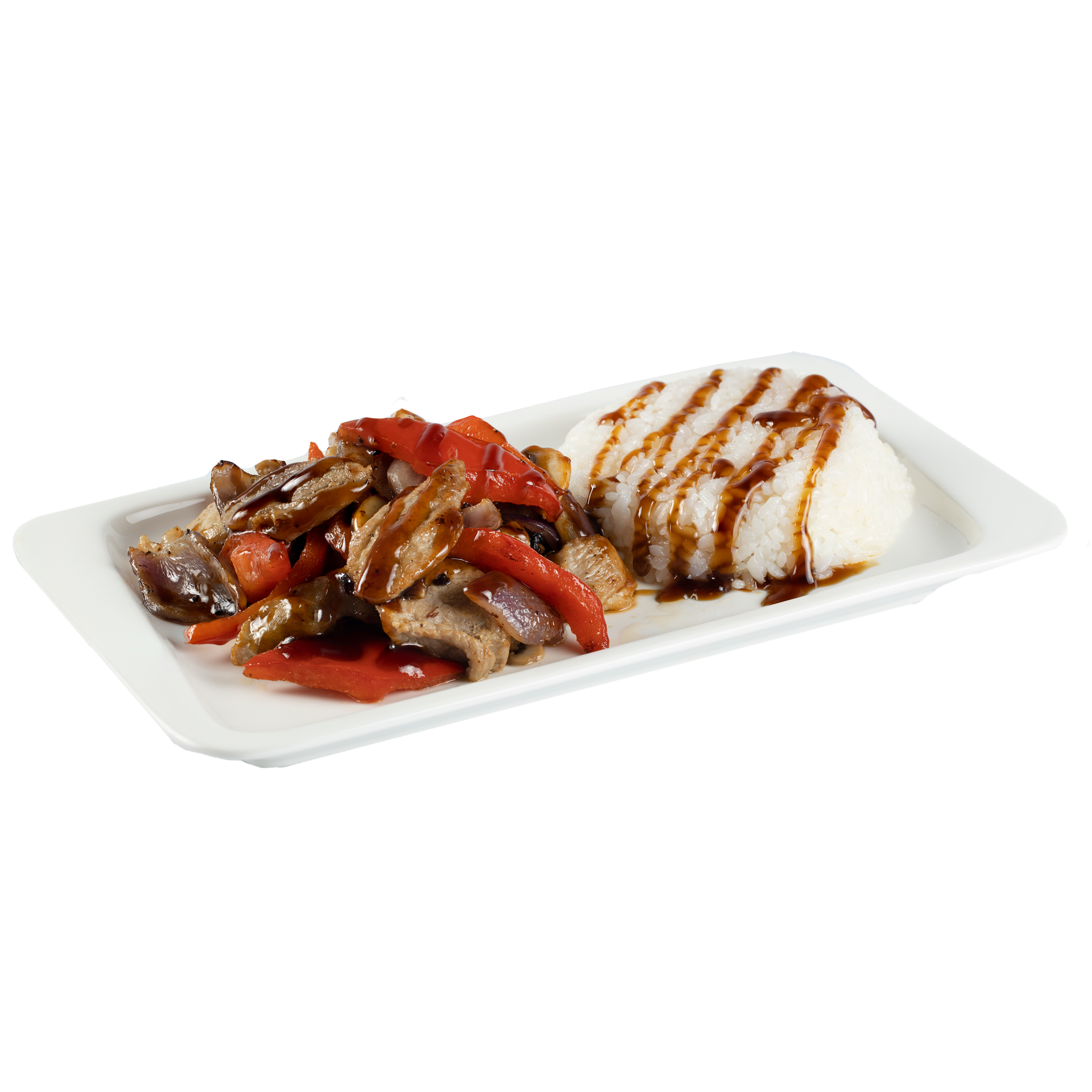 Состав: свинина, грибы шампиньоны, перец болгарский, устричный соус, рис