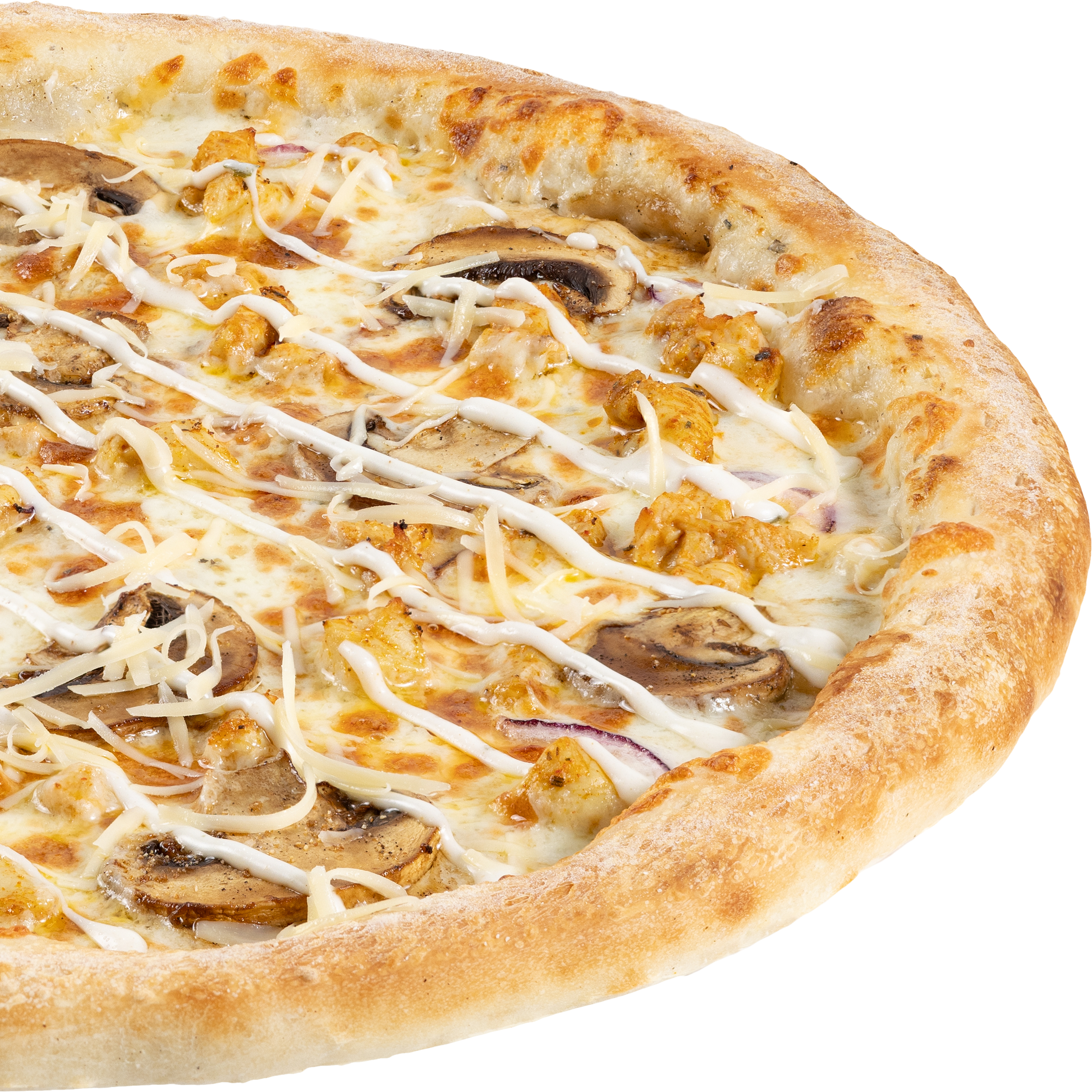 Состав: соус грибной фирменный, сыр моцарелла, сыр гауда, лук красный, курица, шампиньоны маринованные, сыр пармезан