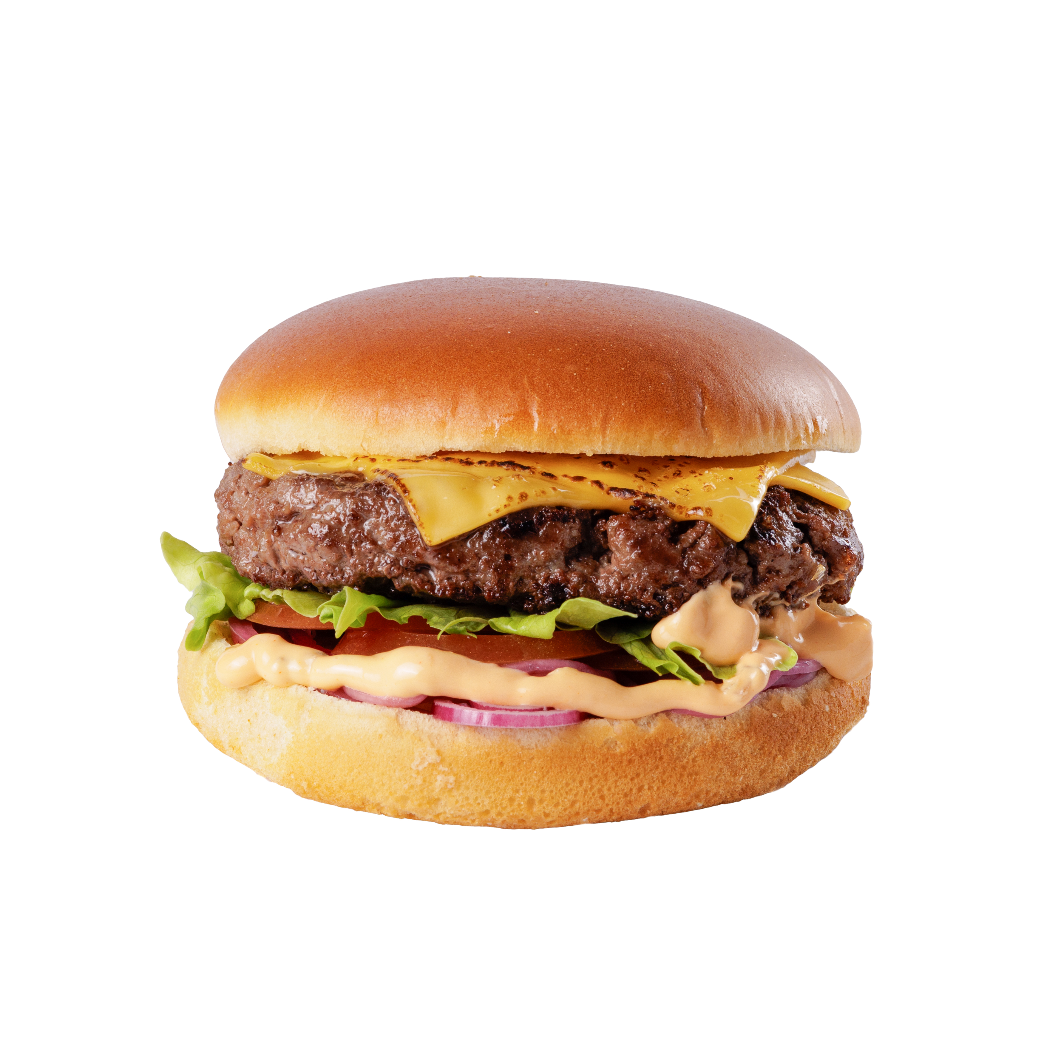 Состав: Булочка бриошь, говяжья котлета, соус бургер, лук красный маринованный, помидор, салат айсберг