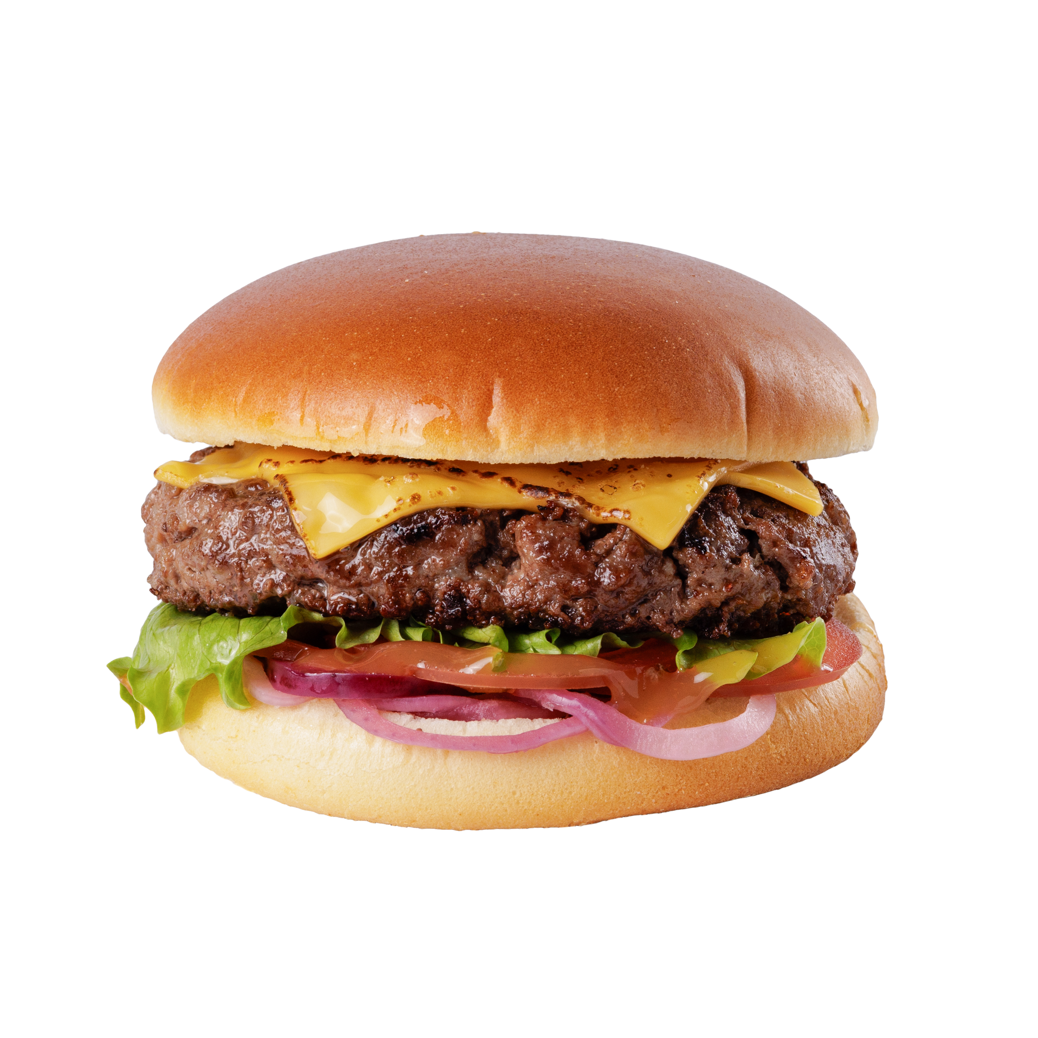 Состав: Булочка бриошь, говяжья котлета, соус кисло-сладкий, соус табаско, лук красный маринованный, сыр чеддер, салат айсберг, помидор